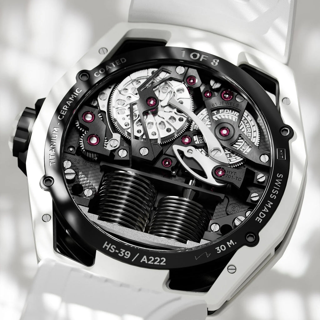 The HYT Conical Tourbillon Panda features a 48mm diameter titanium case, is water-resistant up to 30 meters, and mirrors the shape and size of previous Conical Tourbillon models. The case is coated in white ceramic, extending to the titanium side grilles and frame. This finish continues onto the crown, which includes a black DLC titanium insert. The dial is topped by an ultra-domed sapphire crystal with AR treatment, showcasing a white agate chapter ring with three-dimensional, black-coated indices treated with Super-LumiNova, along with the HYT logo at the 6 o’clock position. The HYT’s signature retrograde hour indication is represented by black and white liquids propelled by bellows inside a borosilicate capillary tube. Minutes are indicated by a matte black pointer hand with white Super-LumiNova.