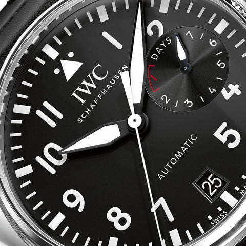 IWC influenced the cockpit-instrument look of classic pilot´s watches during the 1930s and 1940s. The white triangular index at "12 o'clock" allowed pilots in the cockpit to instantly recognize the position of the hands and the time at a glance. The upright equilateral triangle has two dots at either side to make the dial easier to read, and is also luminescent.
